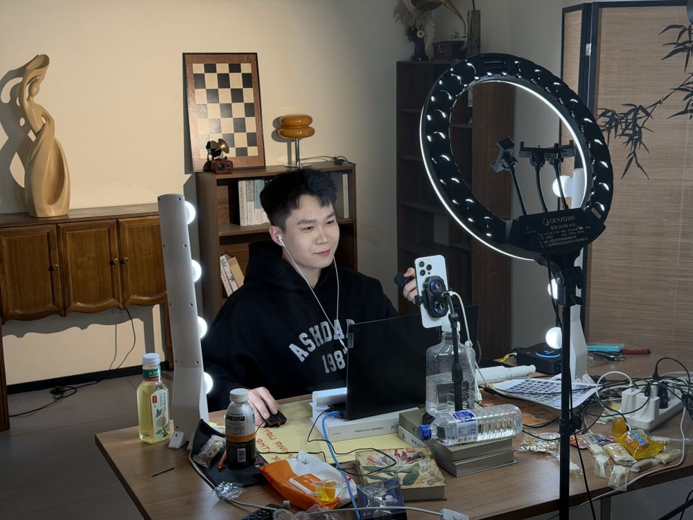 長(zhǎng)春街頭,主播帶上燈架,開(kāi)啟直播。新華社記者唐銘澤 攝