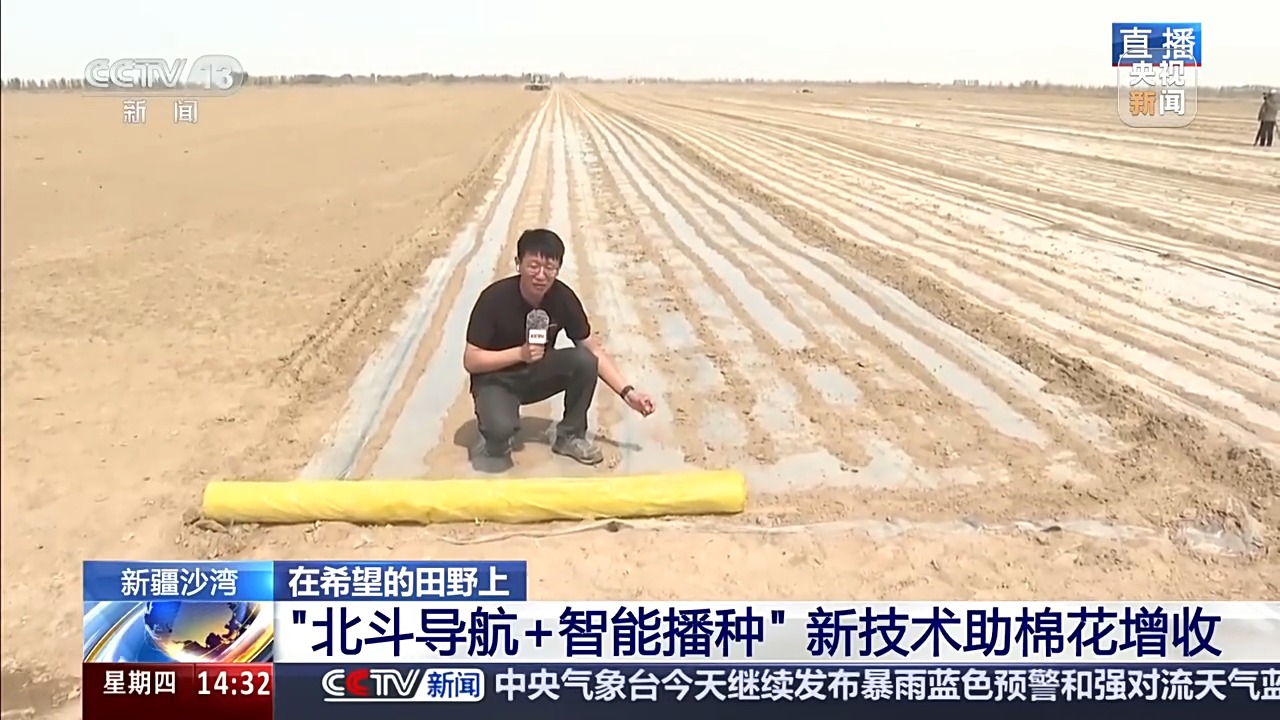 高鵬飛:您瞧,我身后這臺(tái)棉花播種機(jī),正不緊不慢地往前開(kāi)。從空中看下去,播完種的土地就像鋪上了一條條透明的絲帶,筆直筆直的。怎么能做到這么整齊劃一?全靠有北斗導(dǎo)航的無(wú)人駕駛設(shè)備。這種設(shè)備精度很高,每公里誤差不超過(guò)2厘米。為什么要這么精準(zhǔn)?因?yàn)楹竺娴闹懈?、打藥這些田間管理,也都靠帶著北斗導(dǎo)航的設(shè)備來(lái)干。這樣從播種到管理,環(huán)環(huán)相扣,無(wú)縫銜接。像這種復(fù)合式精量化播種機(jī),后面還掛著好幾個(gè)裝置,它一過(guò),鋪設(shè)滴灌帶、地膜、打孔、下種、覆土一氣呵成。一臺(tái)機(jī)器一天能干120多畝,效率那是翻著跟頭往上漲。