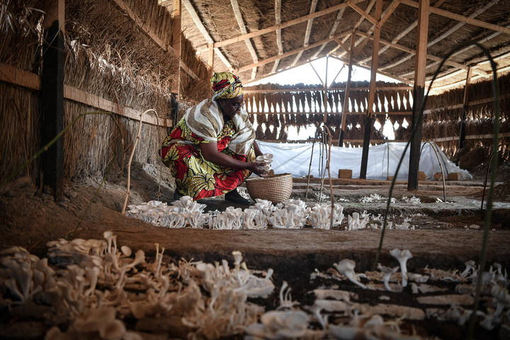 2024年2月6日,在中非共和國(guó)達(dá)馬拉,法蒂瑪在菇棚內(nèi)收獲菌草菇。2022年,法蒂瑪在聽(tīng)說(shuō)中國(guó)菌草專(zhuān)家在班吉傳授技術(shù)后主動(dòng)前往學(xué)習(xí),從一間小菌棚起步,逐漸擴(kuò)大為如今小有名氣的合作社?!⌒氯A社記者 韓旭 攝