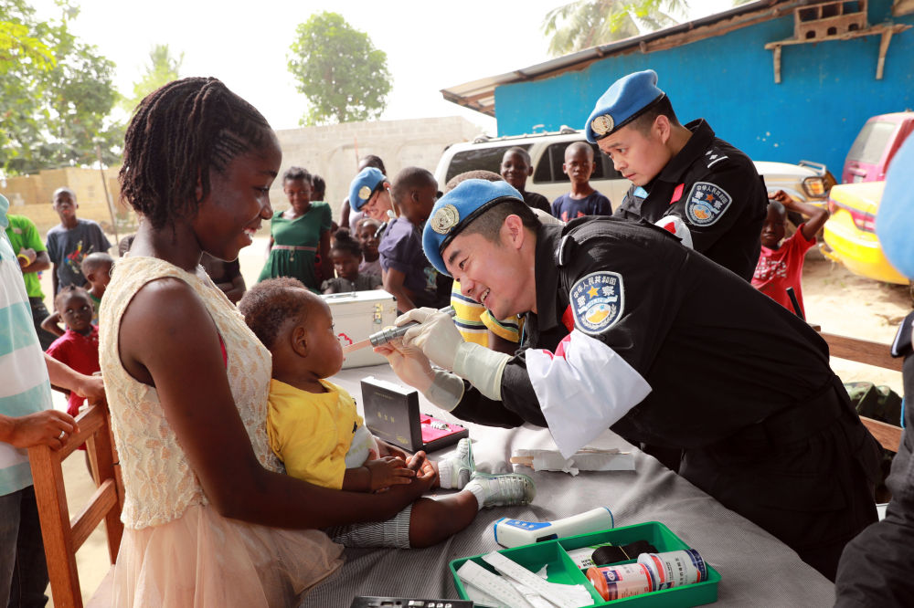 2015年11月3日,在利比里亞格林維爾一座村莊,中國維和警察防暴隊(duì)隊(duì)員詢問近期治安等情況。