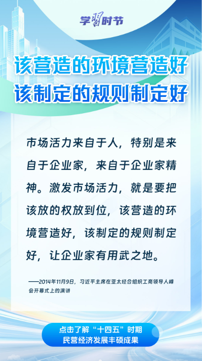 “十四五”時期,廣大民營企業(yè)和民營企業(yè)家篤定信心、乘勢而上,為中國經(jīng)濟高質(zhì)量發(fā)展注入了蓬勃生機與強勁動能。通過一組海報,共同學(xué)習(xí)習(xí)近平總書記關(guān)于民營經(jīng)濟發(fā)展的重要論述,回顧“十四五”時期我國民營經(jīng)濟破浪前行、活力迸發(fā)的生動實踐與豐碩成果。