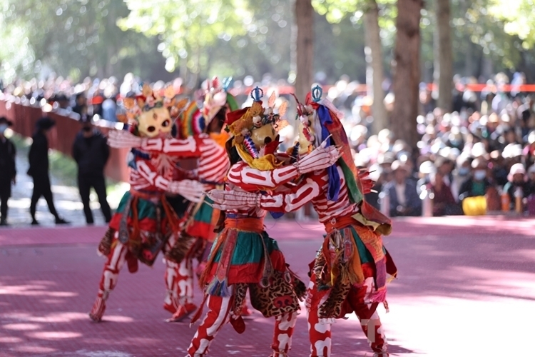 當(dāng)渾厚悠遠(yuǎn)的法號、法螺聲在大院內(nèi)外回旋開來,“羌姆”表演正式拉開帷幕。期間,僧人頭戴面具,身穿戲裝,手持鼓刀斧等道具,逐次表演金剛、骷髏、鹿牛、比丘、鴉鴟、六長壽等數(shù)十節(jié)神舞,氣氛莊重而神秘。