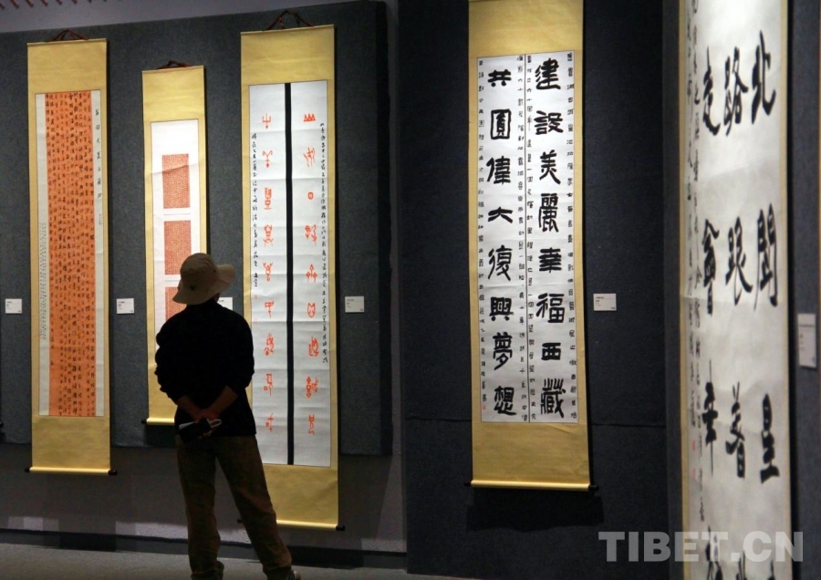 圖為觀眾在“雪域古城·圣地拉薩”第七屆書畫攝影藝術展欣賞書法作品 攝影:趙釗
