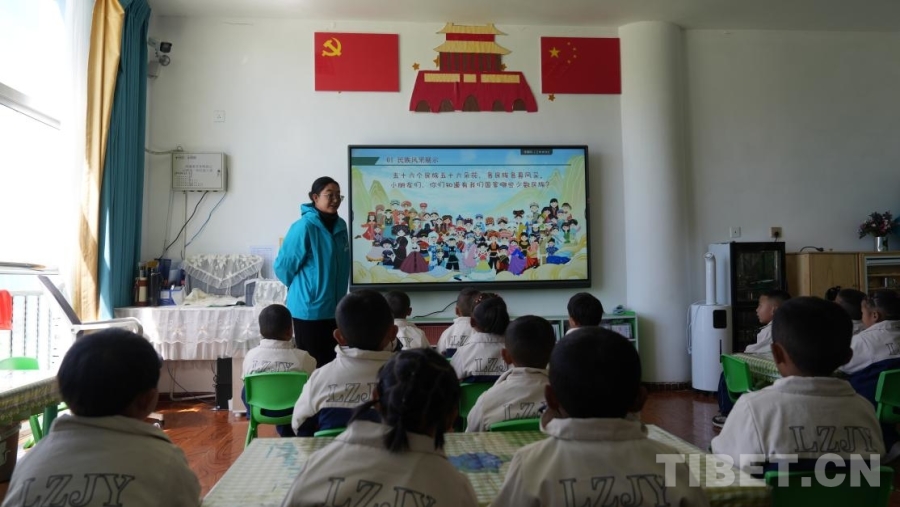 在西藏日喀則市拉孜縣第二幼兒園中(1)班教室里,老師郁瓊珠姆話音剛落,孩子們的回答便齊聲響起,清脆而堅定。屏幕上,56個民族的卡通形象匯聚于一幅畫之中。她接著問道:“那我們國家遼闊的土地上,生活著多少個民族?”一只只小手高高舉起,搶答聲此起彼伏:“56個!”對孩子們而言,這些答案已經成為日常學習生活中耳濡目染的常識。
