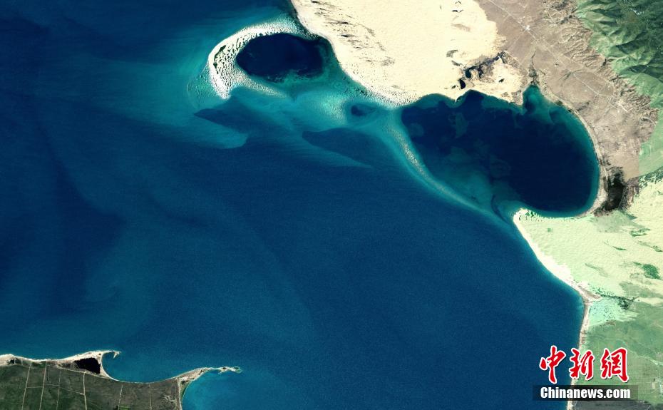9月27日,航拍青海省海北藏族自治州海晏縣關(guān)停的青海湖沙島景區(qū)內(nèi)的太陽(yáng)湖。(無人機(jī)照片) 中新社記者 馬銘言 攝