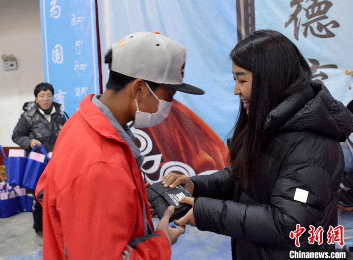 2021年,西藏那曲公益捐贈(zèng)活動(dòng)中,德慶玉珍(右)為青少年兒童送上成長(zhǎng)愛心包。(資料圖片) 受訪者 供圖