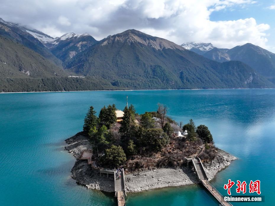 3月30日,航拍巴松措湖心島。巴松措又名錯(cuò)高湖,位于西藏自治區(qū)林芝市工布江達(dá)縣,是西藏首個(gè)自然風(fēng)景類國(guó)家5A級(jí)旅游風(fēng)景區(qū)。從空中俯瞰巴松措,碧藍(lán)的湖水被雪山、森林環(huán)繞,宛如鑲嵌在群山間的“藍(lán)寶石”。(無(wú)人機(jī)照片)中新社記者 馬銘言 攝