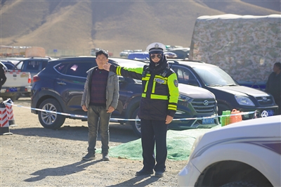 每年的物交會都會有一群節(jié)日期間依然堅守在崗位上、為物交會順利進行保駕護航的工作人員。 圖為交警在指揮車輛有序停放。馬靜 李利改 攝