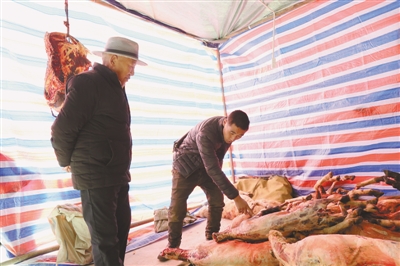 寒冬時節(jié),牛羊肉也是老百姓必備之物。在隆子縣熱榮鄉(xiāng)牦牛銷售點,小小的帳篷里掛滿了牦牛肉,十來個顧客一邊扯著牛腿翻看著,一邊在討價還價。