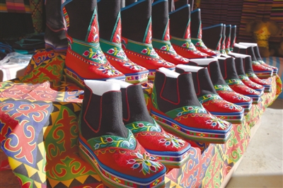 黑色氆氌藏靴是當?shù)厝罕姸绽锎┑男?,不僅結實美觀還很保暖,很受群眾歡迎。巴桑旺姆 攝