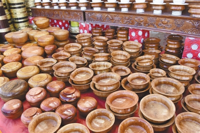 來自阿里地區(qū)普蘭縣的次仁帶著自家的木碗,早早地擺好攤位,等待顧客購買。馬靜 攝