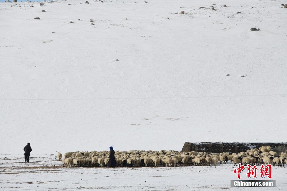 1月26日,牧民在納木錯(cuò)湖邊放牧。雪后的西藏納木錯(cuò)銀裝素裹,美景如畫。 中新社記者 貢嘎來松 攝