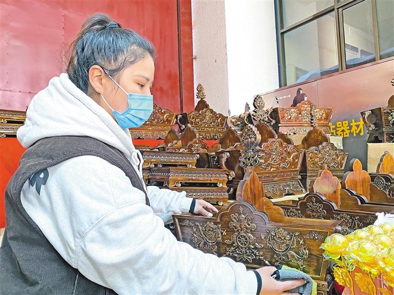 來自山南市貢嘎縣的拉吉帶著自家生產(chǎn)的“切瑪盒”第2次來到八廓商城年貨市場?!坝捎谑亲约疑a(chǎn),所以我們自主設(shè)計了一款線條稍微簡約的‘切瑪盒’;還有一款傳統(tǒng)線條與圖案的‘切瑪盒’。在顏色上,我們選擇了較為持重的深色,這樣的顏色大氣沉穩(wěn),許多市民非常喜歡,兩款售價都是380元?!崩榻B道。