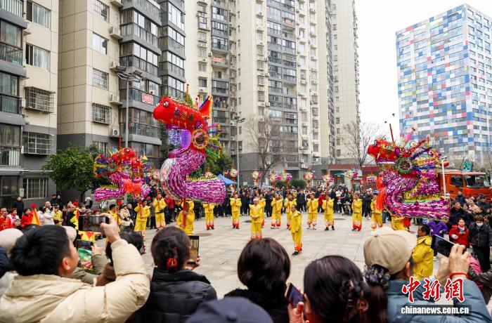 2月27日,湖北武漢,國家級非遺漢陽高龍走進社區(qū)進行表演,以傳統(tǒng)民俗為居民送上馬年元宵祝福。圖為高龍表演吸引民眾觀看。中新社記者 張暢 攝