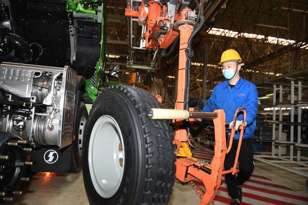 1月20日,工人在陜西汽車控股集團(tuán)有限公司總裝車間進(jìn)行重型卡車裝配。
