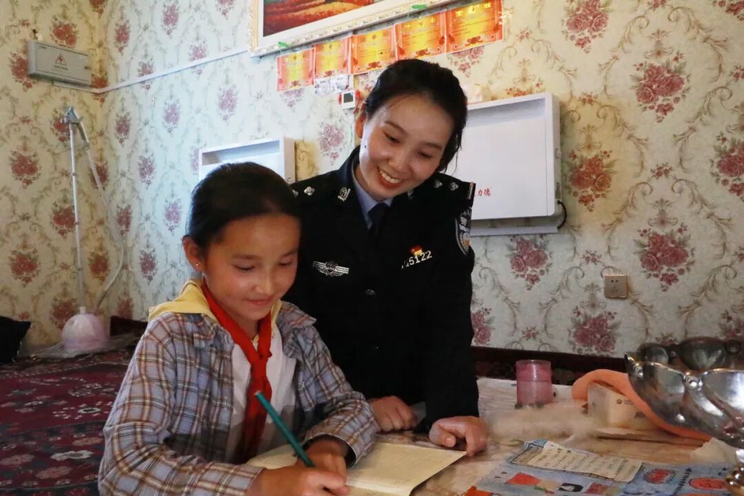 “西極愛(ài)心小分隊(duì)”家訪后了解到阿麗娜的家庭情況,民警沈美穎便成為這位柯?tīng)柨俗巫骞媚锏摹爸慕憬恪?,多次到家中輔導(dǎo)功課,通過(guò)聊天談心鼓勵(lì)阿麗娜認(rèn)真學(xué)習(xí)。